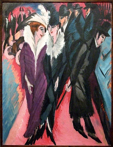 The correct painting described in the question is 'Street, Berlin' by the artist Kirchner, and it belongs to the movement 'The Bridge', which was a group of German expressionist artists.