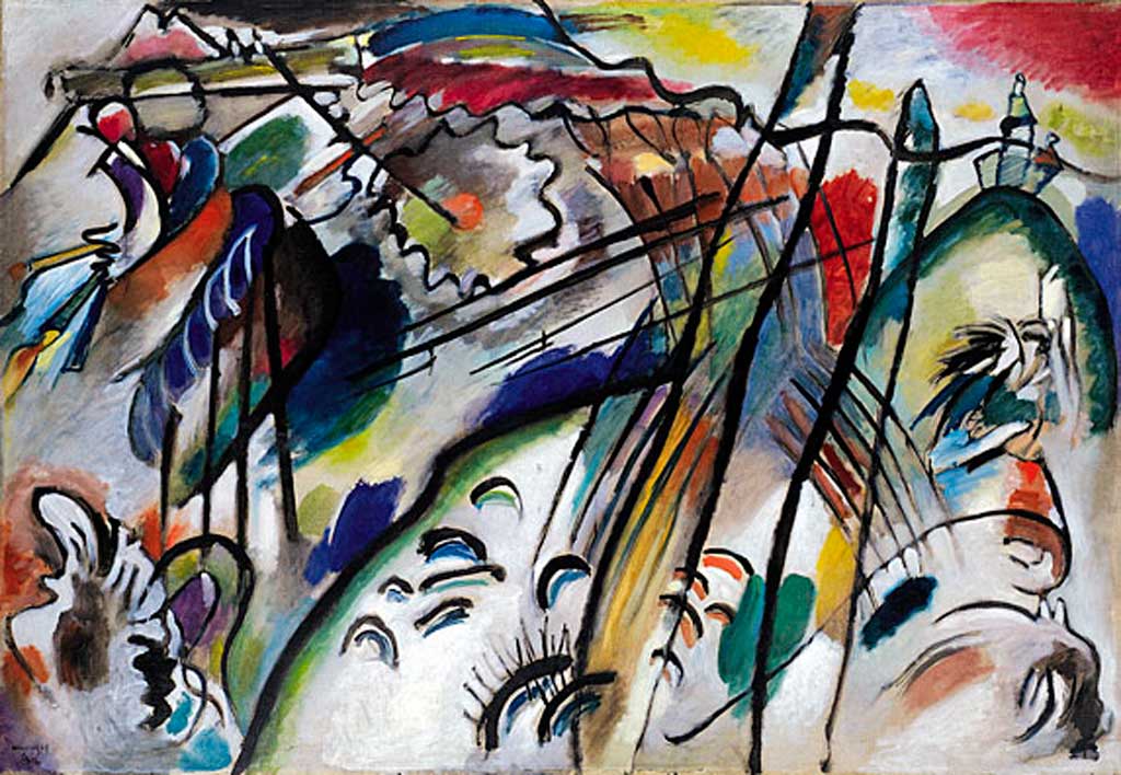 The correct answer refers to the painting 'Improvisation 28' by Kandinsky, belonging to the art movement known as The Blue Rider. The incorrect answers provide titles, artists, and movements from other famous artworks to test knowledge of art history.
