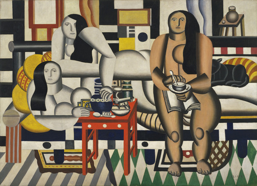 The correct image is titled 'Three Women' by Leger and belongs to the Cubism movement. The incorrect options include 'The Starry Night' by van Gogh, 'Guernica' by Picasso, and 'Composition VII' by Kandinsky, which are from different artists and art movements.