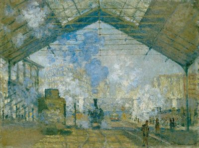 The correct image is identified as Gare St-Lazare by Monet, which belongs to the Impressionism movement. The provided incorrect answers present artworks by different artists and movements, showcasing a variety of styles in art history.
