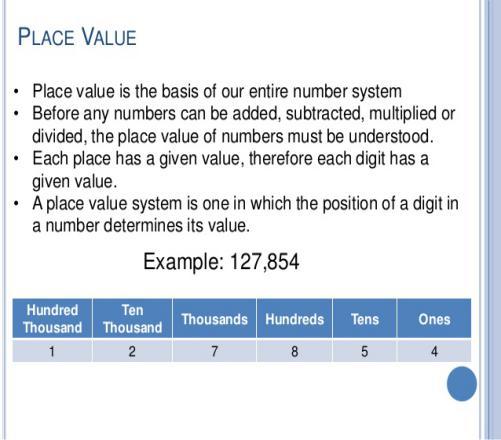 Place value in mathematics is the value represented by a number, in decimal system with digits from 0 -9 based on base is the first column left of the decimal place in the unit column. Take a quiz and test your knowledge on place value numbering position.
