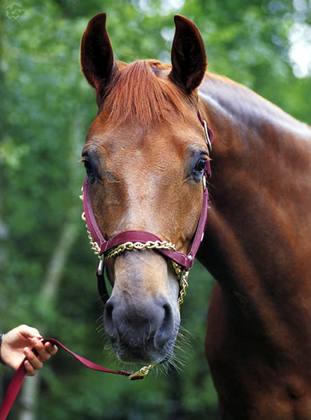 A lead shank with a chain across the nose is a type of equipment used in horse handling. It consists of a lead rope attached to a chain that runs across the horse's nose. This equipment provides additional control and leverage over the horse's head, allowing the handler to guide and direct the horse more effectively. The chain across the nose applies pressure when necessary, encouraging the horse to respond to commands and cues. It is commonly used in training and handling situations where extra control is needed, such as during ground work or leading a strong or disobedient horse.